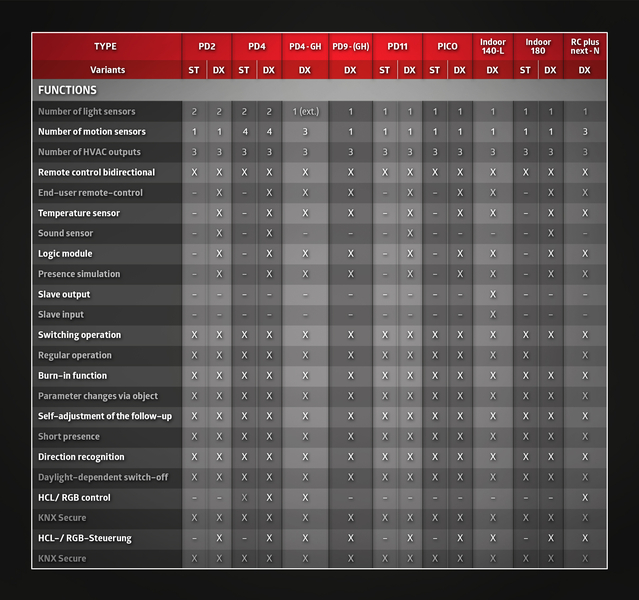 KNX Generation 7 inspires with comforting light which is created using the HCL technology. A new feature is that the optimum room climate is created in every room. The Generation 7 detectors with an integrated temperature sensor, through which individual room temperature control can now be achieved. An integrated offset control enables the setting of different brightness levels within a room. Complex links can be created via the fully integrated logic module.